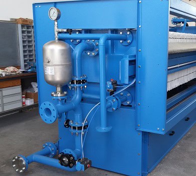 When the filtration cycle begins, the depressurization valve is closed, while the sludge supply valve is open, so that the sludge is allowed to pass from the feeding pump into the filter chambers.